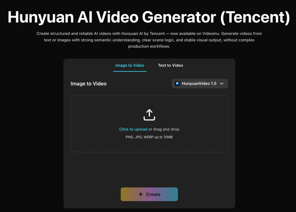 After signing in, open one of Videoinu’s creation tools and choose Hunyuan AI as the model. Videoinu makes both image input and text input available on the Hunyuan AI page, so you can start from either a prompt or an uploaded visual depending on what you already have.