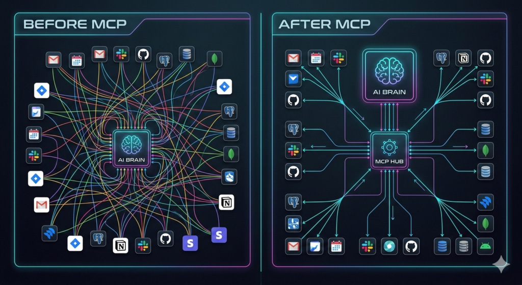 If you had ten AI tools and ten data sources, that meant up to a hundred custom integrations. Messy, expensive, and constantly breaking when either side updated their software.